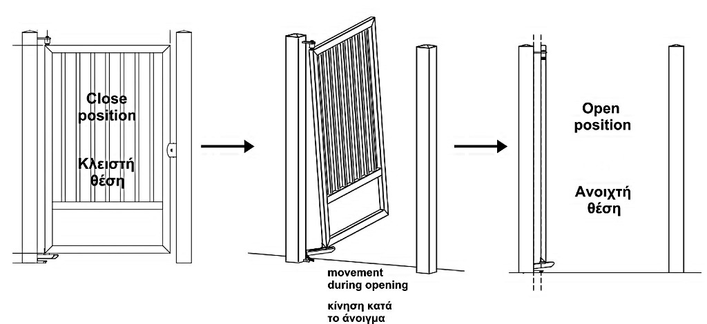 Στο σύστημα παρέχεται ο ειδικός αναδυόμενος μεντεσές ο οποίος τοποθετείται στο κάτω μέρος και το άνω μέρος περιστρεφόμενου μεντεσέ (τύπου μίλι) με ρουλεμάν.